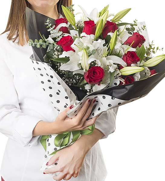 Çiçek : 9 Adet Kırmızı Gül ve 2 Dal Beyaz Lilyumlar